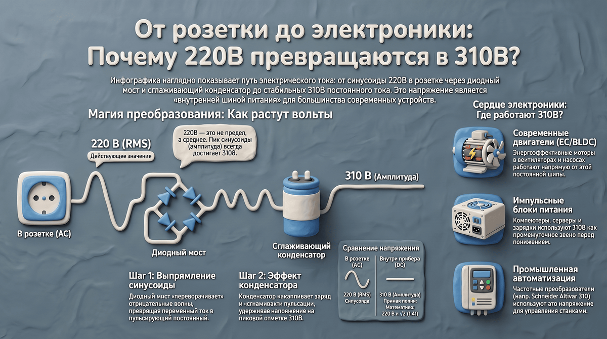 Если вы когда-нибудь разбирали мощный блок питания или заглядывали в «потроха» промышленного частотного преобразователя, вы могли заметить удивительный факт: на вход подается привычное переменное напряжение 220 В, но на главном фильтрующем конденсаторе мультиметр внезапно показывает 310 В. Откуда берутся эти «лишние» 90 вольт? Неужели устройство работает как магическая повышайка?