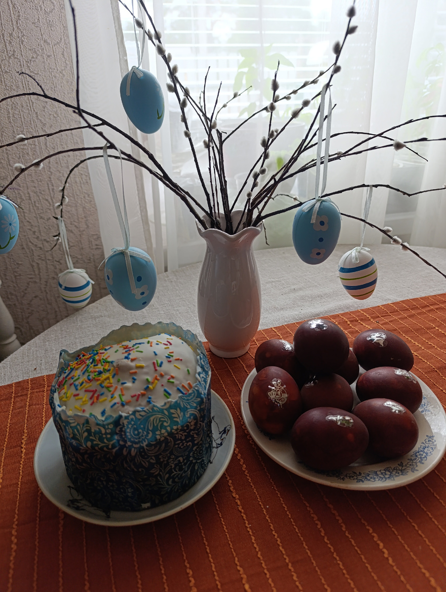 Добрый день всем! Поздравляю со светлым праздником Пасхи! Христос воскресе! Вот и дождались самого главного христианского праздника. У меня не получилось как следует подготовиться, приехала с отпуска в субботу вечером. Но Сережа сделал всё как надо, накрасил яиц луковой шелухой, купил кулич. Праздничное утро началось как и положено- разговелись яйцом и куличом. Пост мы не соблюдаем, не пришли к этому, но традиции в семье передаются из поколения в поколение.