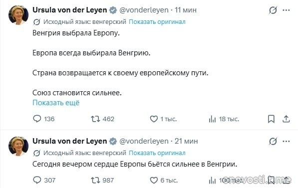 На выборах в Венгрии победили проевропейские силы. Глава Еврокомиссии не замедлила с реакцией. Сегодня вечером сердце Европы бьётся сильнее в Венгрии. Венгрия выбрала Европу Урсула фон дер Ляйен, глава ЕК оновости.