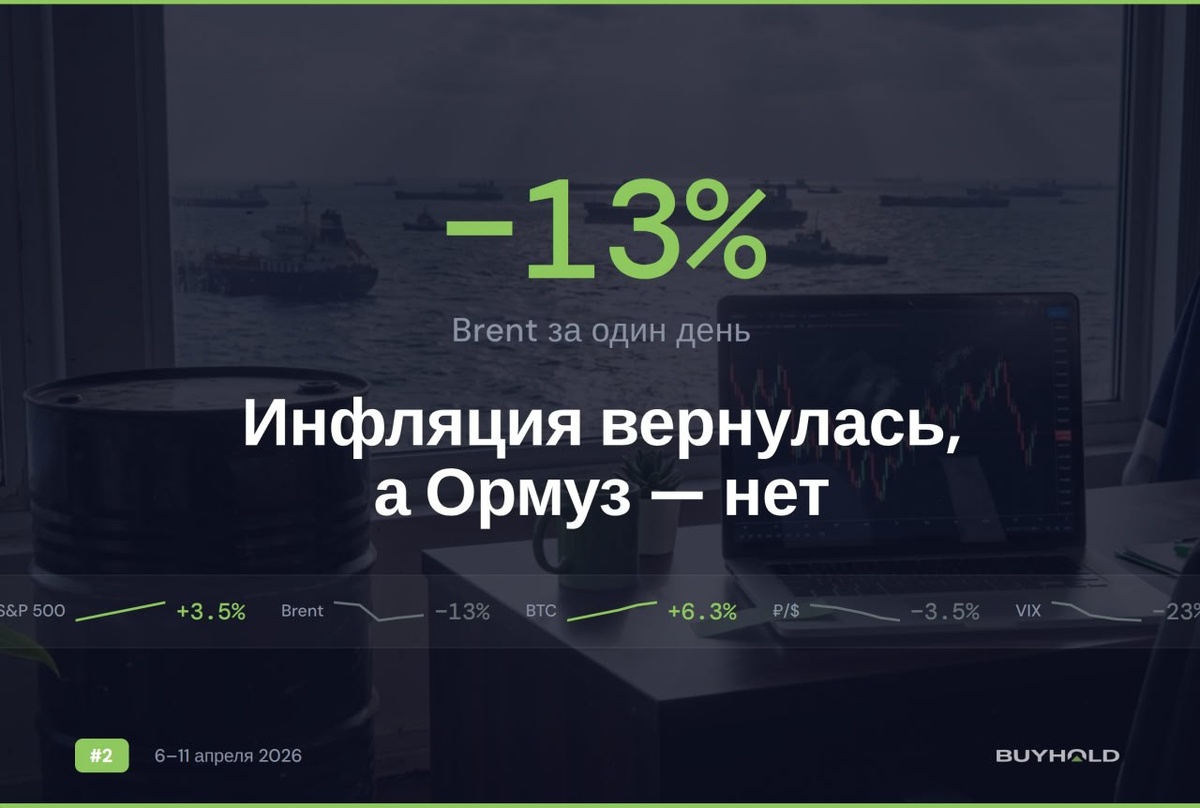 Инфляция вернулась, а Ормуз — нет Ключевые цифры недели: ▸ Brent: −13% за день (обвал до $94 на перемирии) ▸ S&P 500: +3,48% — лучшая неделя с ноября ▸ ₽/$: 76,97 (−3,5% за неделю) ▸ BTC: $73 333 (+6,3%) ▸ VIX: −23% — страх отступил Перемирие США–Иран обрушило нефть, но Ормузский пролив так и не открылся — 600+ судов по-прежнему заблокированы. Инфляция в США подскочила до 3,3%, а ФРС оказалась в ловушке: энергетический шок она исправить не может. Рубль тем временем укрепился ниже 77 — и это окно может закрыться уже 24 апреля. 👉 Читать полностью: https://buyhold.ru/obzor-rynka-6-11-aprelya-2026-inflyatsiya-vernulas-a-ormuz-net/