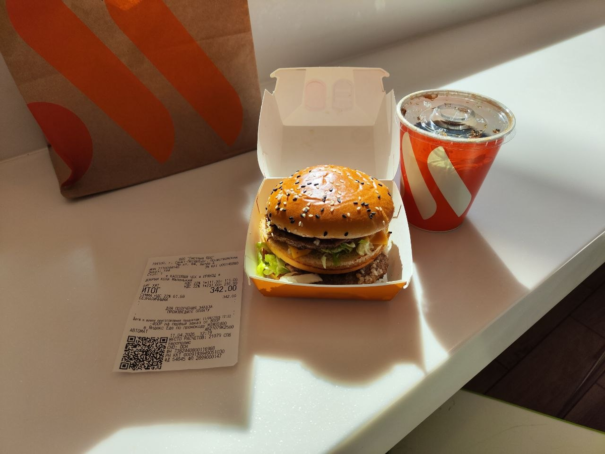 Я экспериментально проверяю "Правило-4%", согласно которому можно накопить 300 ежемесячных расходов, и этих денег должно хватить на всю жизнь. Ведь при дозированном изъятии сбережения способны сами себя воспроизводить и не снижаться даже с поправкой на инфляцию. Это 13-я закупка в рамках эксперимента, в котором я положил на отдельный счёт сумму, равную 300 наборам "Бигмак-Кола", и теперь ежемесячно снимаю с него средства. Подставьте вместо бигмаков что угодно - коммуналку, подписки на сервисы или все расходы на жизнь. Суть не поменяется, вопрос лишь в размере стартового капитала. Набор стоит 342 рубля (231+111). Снова подорожал! Рост цены за полный год составил 12%. Инфляция по Росстату за тот же период составила 6%. Причём, оба компонента (и Бигмак, и Кола) выросли в цене одинаково, на 12% каждый. Дольше всего одинаковая цена держалась с мая по август 2025 - всего 4 месяца. В 2025 году цены повышались на 3-5 рублей, а в 2026 году - на 10-15 рублей при каждом повышении. Замедление инфл