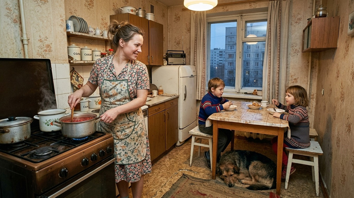 Я вошла на два шага и увидела картину, от которой у меня буквально заложило уши. В моей кухне, за моим столом, сидели двое детей. Третий, босой, катался на стуле. На подоконнике стояла клетка с хомяком. Под столом лежала лохматая рыжая собака. У плиты — женщина в домашнем халате.