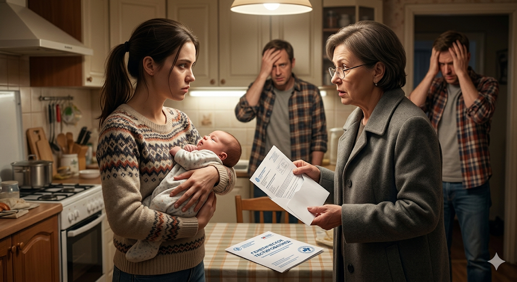 Зинаида Петровна появилась без звонка — как всегда. Прошла в квартиру, не снимая пальто, окинула взглядом кухню, коридор и наконец остановилась у детской кроватки, где сопел трёхмесячный Гришенька. Постояла. Покачала головой с видом человека, который наконец получил подтверждение давнему подозрению.