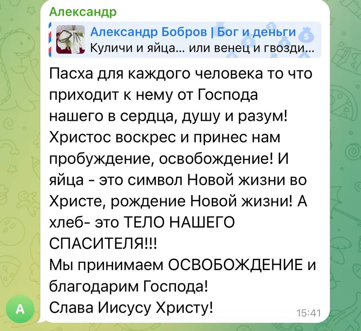 Мои мысли: Я не против символов, о которых вы говорите — яиц и куличей. Важно другое — правильно расставлять приоритеты. В Библии нет упоминания ни о яйцах, ни о куличе как о символах Пасхи. Более того, в еврейской Пасхе было повеление убрать всё квасное из дома: «семь дней не должно быть закваски в домах ваших…» (Исход 12:19) Потому что квасное — это образ греха, чего-то, что распространяется и изменяет состояние. А кулич, по сути, как раз и делается из квасного теста. И здесь важный момент. В Писании именно пресный хлеб имеет прообразное значение. «очистите старую закваску, чтобы быть вам новым тестом, так как вы бесквасны…» (1 Коринфянам 5:7) Закваска — это образ греха. А пресный хлеб — это образ чистоты. И когда мы говорим о Христе: «сие есть Тело Моё…» (Луки 22:19) Хлеб, который используется в хлебопреломлении - пресный, потому что Иисус — без греха. Поэтому здесь важно понимать: • квасное — образ греха • пресное — образ чистоты • Христос — совершенная чистота, без за