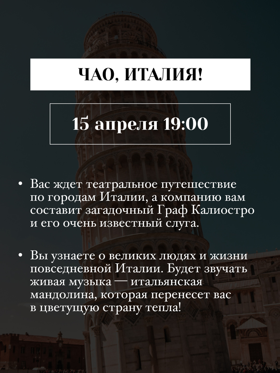 ГАСТРОНОМИЧЕСКИЙ ТЕАТР В КРОМЕШНОЙ ТЕМНОТЕ «ЧАО, ИТАЛИЯ!» 🍝🇮🇹 // 15 апреля 19:00