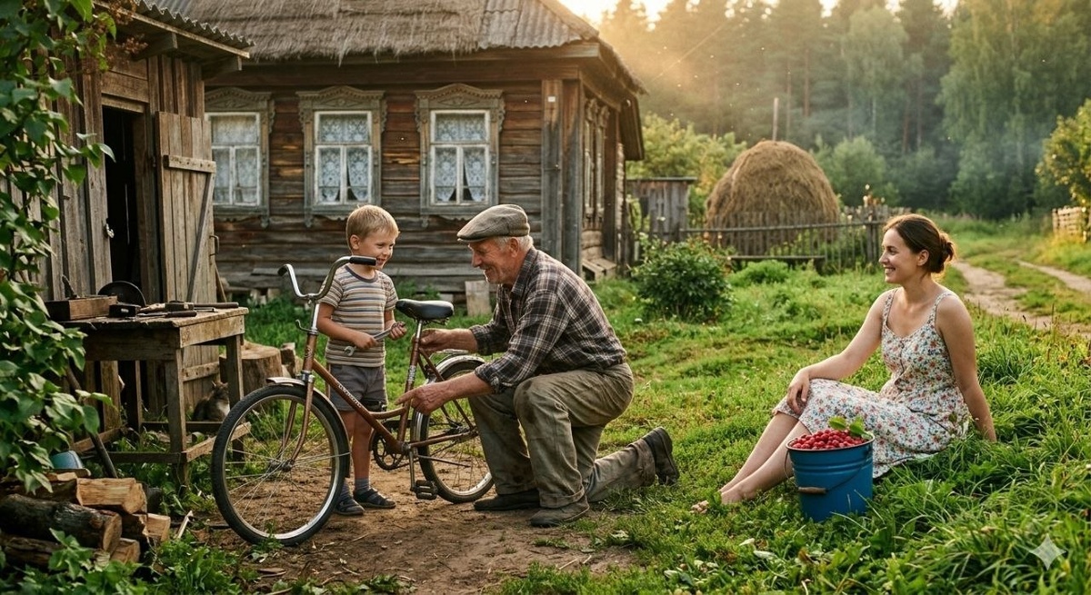 Участник конкурса. На ноги не обращайте внимание :) A photorealistic, nostalgic scene in warm golden hour lighting. A rustic countryside setting featuring multiple generations. An elderly man in a vintage cap teaching a young boy how to fix a bicycle or chop wood, both sharing a genuine smile. Nearby, a young woman in a sundress rests on the grass next to a brimming enamel bucket of fresh raspberries. In the background, a cozy wooden dacha with carved window frames, a haystack, and a distant misty forest. Golden dust motes dancing in the sunlight. Evocative of 1980s-90s film photography, soft grain, emotional warmth, peaceful atmosphere of rural labor and summer bliss. 8k resolution, cinematic lighting. "Soviet childhood nostalgia" "Kodak Portra 400 style" most-AI.com - 80+ популярных нейросетей в одном приложении без VPN. Лучшие цены! 75% кэшбэка на бонусный баланс по промокоду PROMPT1RU_75 Еще у нас есть группа VK и специальный раздел на сайте https://prompt1.ru/tematika-izobrazhe