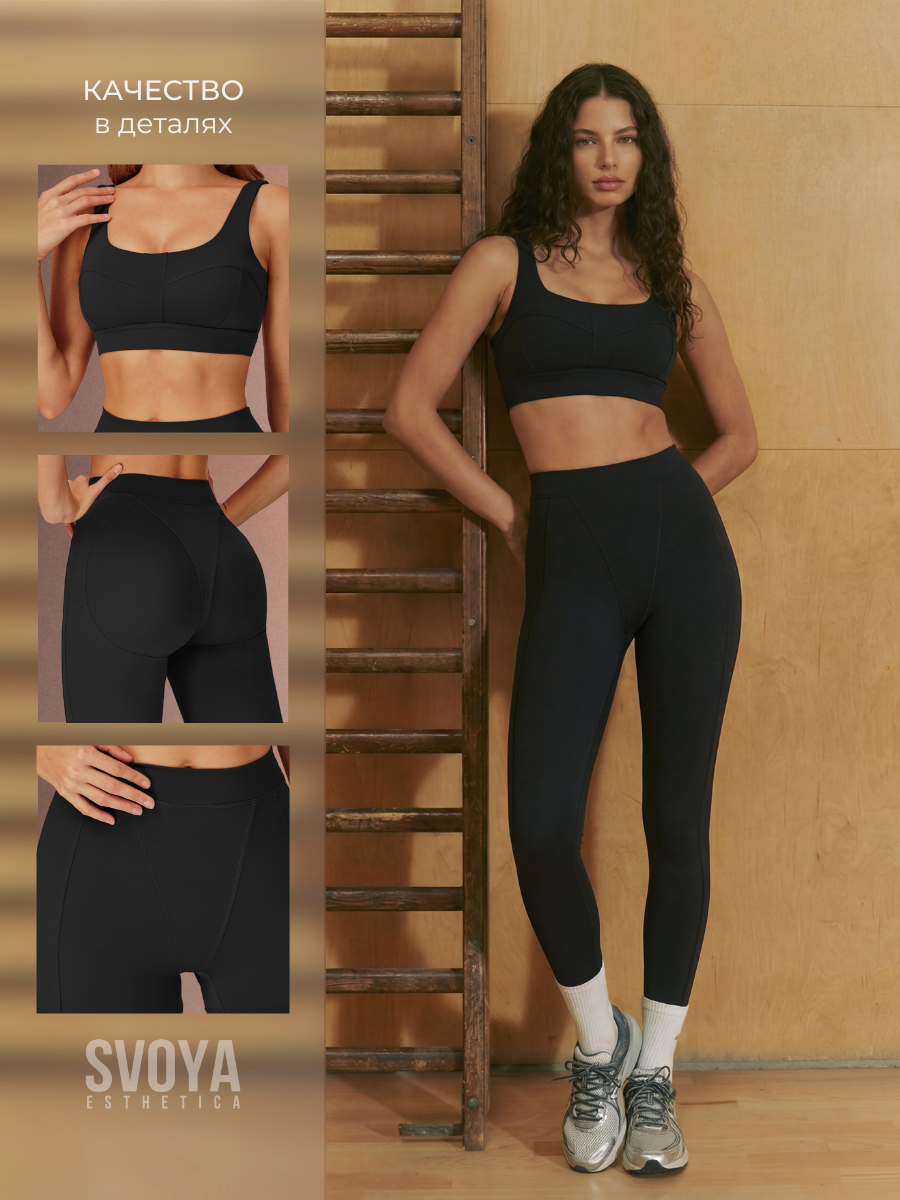Плотный эластичный материал мягко утягивает и подчёркивает фигуру, не сковывая движений. Подходит для тренировок, йоги, фитнеса и прогулок по городу. Минималистичный дизайн вдохновлён эстетикой премиальных брендов Alo Yoga и Skims.