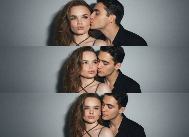 Используй лица с референс-фотографии (face reference), сохрани узнаваемость на 100% : не меняй овал лица , форму носа , форму бровей, губы, цвет глаз, длину волос и цвет волос .Вертикальный коллаж из трех фото Y2К.Парень и девушка позируют на нейтральном светло сером фоне.Жесткое прямое освещение от вспышки ,создающее резкие тени на стене позади и эффект пересвета. Девушка с красивой, объемной укладкой волосы распущенные, укладка сделана на брашинг. Ресницы густо накрашены и разделены.Кожа имеет сияющий финиш с выраженным использованием хайлайтера на скулах, лбу и переносице. На щеках заметны персиково-розовые румяна.Губы накрашены нюдовым блеском с влажным эффектом, подчеркивающим их. Девушка одета в коричневое платье с тонкими бретелями, перекрещивающимися на шее и груди, на мужчине черная рубашка , с двуями расстегнутыми верхними пугавицами .На первой фотографии они очень близко к камере,девушка смотрит в сторону делая губы уткой, парень целует её в щеку, на втором кадре девушка развернута и голова кокетливо повернута к объективу, укладка не много прикрывает ее лицо, но не сильно, а парень обнимает ее и смотрит на девушку; на третьей фотографии она смотрят в объектив, улыбаясь слегка. Крупный и средний план,минималистичная композиция, винтажная цифровая текстура, легкая размытость, гламурная атмосфера. Фото сделано на iPhone 17 Pro Max со вспышкой. Формат 9:16