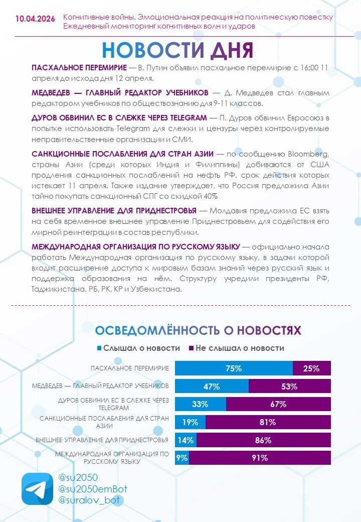 10.04.2026 🔹 Большинство опрошенных (68%) находятся в спокойном состоянии. Усталость отметили 15%, бодрость — 9%, а нервозность остается на минимальном уровне (5%). 🔹 Осведомленность о новостях этого дня — на среднем уровне. — Наиболее известной (75% слышали) оказалась новость о том, что В. Путин объявил пасхальное перемирие с 16:00 11 апреля до исхода дня 12 апреля. — Наименее известным (только 9% были осведомлены) стало сообщение о том, что официально начала работать учрежденная президентами РФ, Таджикистана, РБ, РК, КР и Узбекистана Международная организация по русскому языку, в задачи которой входит расширение доступа к мировым базам знаний через русский язык и поддержка образования на нём. 🔹 Ярко выраженный негативный отклик вызвало сообщение о том, что Молдавия предложила ЕС взять на себя временное внешнее управление Приднестровьем для содействия его мирной реинтеграции в состав республики. 32% читателей отнеслись к сообщению нейтрально. Остальные респонденты отреагировал