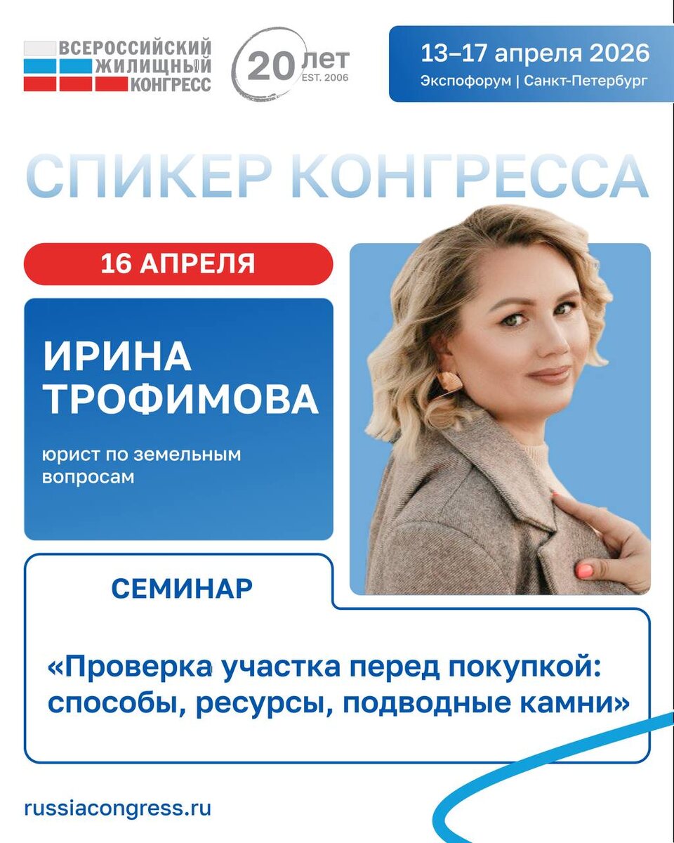 ! 🏢⚡️ Завтра в Петербурге стартует масштабное событие - Всероссийский Жилищный Конгресс. И я рада сообщить, что буду частью этого события в качестве спикера. 16 апреля мы с моим партнером Евгенией Хрулевой представим наш совместный доклад: 🔎 «Цифровой рентген участка: возможности и ограничения сервисов для проверки». Мы подготовили для вас обзор инструментов, практику применения и наши личные рекомендации по «рентгену» участков перед покупкой. Никакой воды, только рабочие сервисы и подводные камни, о которых важно знать. Ждем коллег, партнеров и всех желающих на наше выступление! 📍 Где: Санкт-Петербург, Всероссийский Жилищный Конгресс. Экспфорум 🗓 Когда: 16 апреля, Семинар «Проверка участка перед покупкой: способы, ресурсы, подводные камни» 📲 Подписывайтесь на мой канал в МАХ!