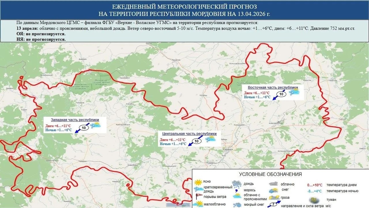 ☁️⛅⛈️ 13 апреля в Мордовии облачно с прояснениями, небольшой дождь