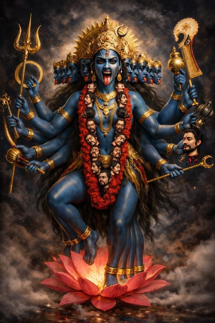 Из огненного облака, возникшего из гнева этих божеств, появилась Кали — воительница, объединившая в себе пламя Шивы, мощь Вишну, силу Индры и боевые способности других небожителей. Каждый бог дал ей свое оружие: топор, трезубец, лук, стрелы, петлю и палицу.