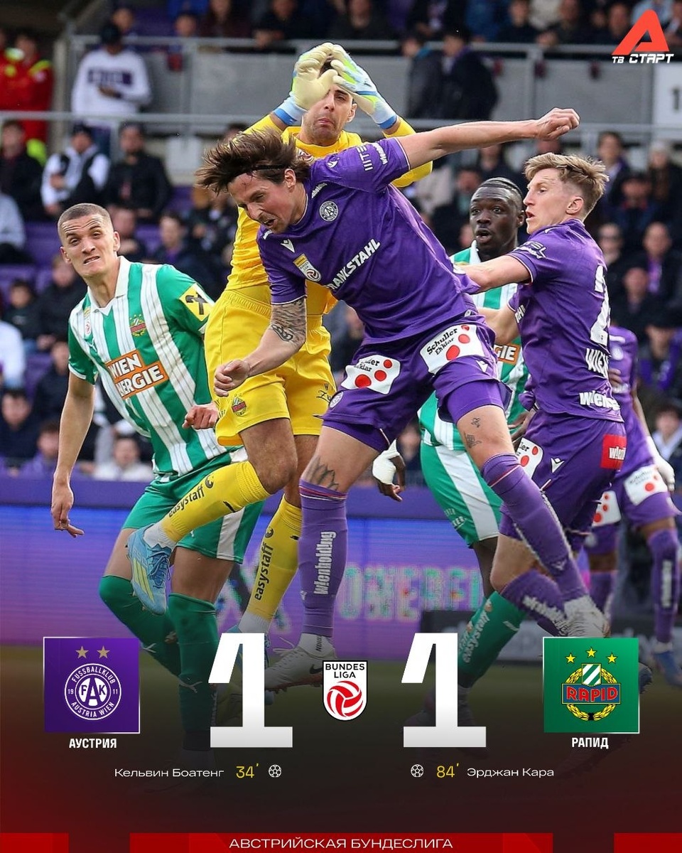 ! На 84-й минуте «Рапид» от поражения спас Эрджан Кара – 1:1. «Зелено-белые» остаются в тройке лидеров по итогам 26-го тура 💪 Подписывайся на ТВ СТАРТ в MAX📲
