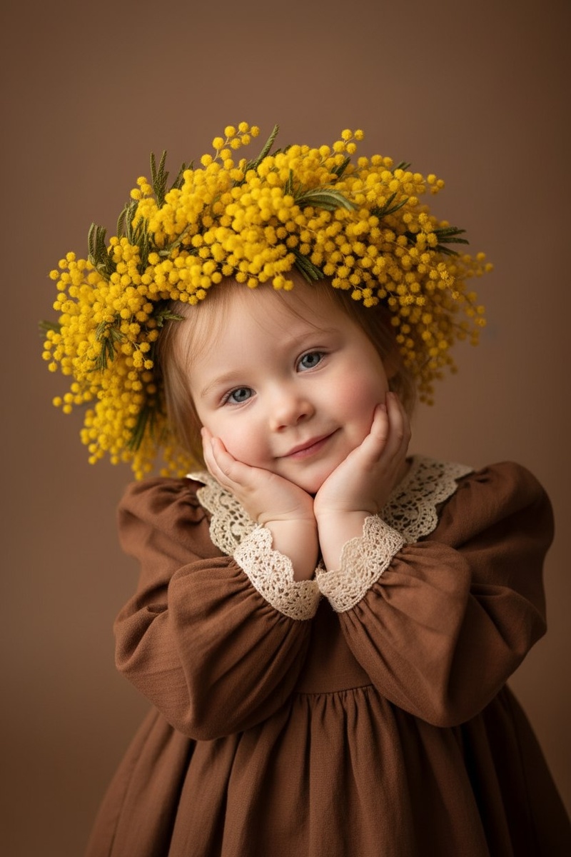 Не меняй черты лица. Девочка 4 года. Средний крупный план, ракурс на уровне глаз, снято портретным объективом 85мм с широкой диафрагмой f/1.8, создающей очень мелкую глубину резкости и кремовое боке. В центре композиции — очаровательная девочка с нежной, безупречной фарфоровой кожей, естественным румянцем на щеках. Взгляд смотрит прямо в камеру. На голове девочки пышный, густой венок, полностью состоящий из множества ярко-желтых, пушистых цветов мимозы, создающий эффект солнечной короны. Она одета в платье или блузку насыщенного теплого шоколадно-коричневого цвета, выполненную из мягкой, матовой ткани, возможно хлопка или льна, с видимой текстурой и легкими складками. Рукава платья объемные, типа "фонарик", собранные у плеч и запястий, а воротник и манжеты украшены изысканным, ажурным кружевом кремового оттенка с тонким, детализированным узором. Девочка слегка наклонила голову влево, ее руки сложены вместе под подбородком, ладони прижаты к щекам, что придает ее позе особую миловидность и застенчивость. На лице играет нежная, искренняя улыбка. Освещение мягкое, рассеянное, фронтально-боковое, исходящее сверху справа, создающее едва заметные, очень мягкие тени под подбородком и носом, подчеркивающие контуры лица. Теплый цветовой баланс, легкие блики на коже лба, переносицы и щек. Фон абсолютно однородный, полностью размытый, теплого сепийно-коричневого оттенка, немного темнее цвета платья, без каких-либо отвлекающих элементов. Общая цветовая палитра теплая, землистая, с ярким акцентом солнечного желтого цвета мимозы и голубых глаз девочки . Атмосфера нежности, невинности, радости и весеннего тепла. Фотореалистично, гиперреалистично, шедевр, высочайшее качество, 8k, резкий фокус, невероятная детализация, текстура кожи, текстура ткани, текстура цветов.