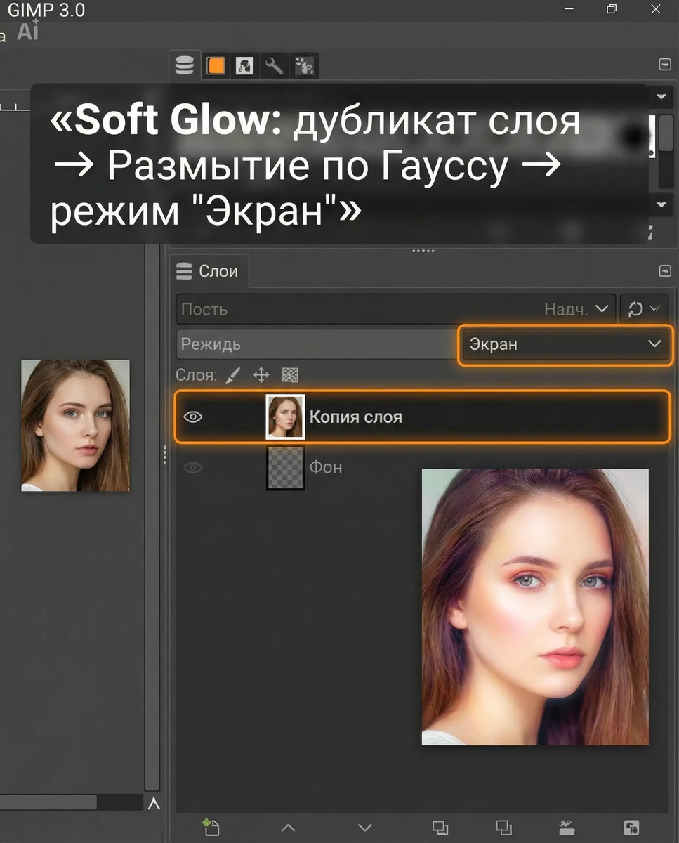 2 дня назад 3 229 просмотров 4 мин Пошаговый разбор трёх встроенных фильтров GIMP 3.0, о которых молчат в базовых уроках. Повторит даже новичок. Как за пару минут добавить снимку мягкое свечение, объёмную тень или превратить его в мультяшный рисунок? GIMP 3.0 вышел с кучей улучшений, но многие до сих пор используют его как старую версию — кадрирование, яркость-контрастность, сохранение. А ведь внутри спрятаны фильтры, которые за пару кликов делают картинку визуально дороже и интереснее. Сегодня разберём три таких эффекта: мягкое свечение для портретов, падающую тень для текста и объектов, а также мультяшный фильтр для быстрой стилизации. Все примеры — из бесплатного GIMP 3.0, никаких плагинов. Мягкое свечение — классический приём ретуши, который добавляет коже сияние, а цветам — глубину. В GIMP он делается без сложных масок и кривых. Как повторить: Результат: кожа становится мягче, цвета насыщеннее, появляется лёгкое свечение. Идеально для аватарок, свадебных фото и просто красивых