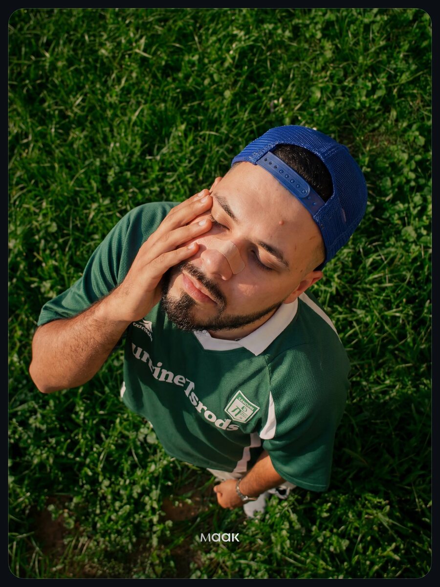 ⭐️ Нейросеть: Higgsfield 📦 Модель: Nano Banana Pro 👤 На фото: @fraank 🧑💻 Промт: The generated person must be exactly the same person as in the uploaded identity photos. Use the identity photos as the ONLY reference for the face. Do NOT copy the face from the reference image. Keep the exact facial structure from the identity photos: same beard shape, same lips, same nose, same forehead, same jawline and same facial proportions. Use the reference image ONLY for scene composition, pose, camera angle and environment. Scene: A man standing upright in dense green grass outdoors. Camera positioned high above the subject looking directly downward (bird's-eye view). The subject tilts his head upward toward the camera with eyes closed. One hand gently touching the face near the eye. A small beige adhesive bandage across the bridge of the nose. Wardrobe: green sports jersey shirt blue baseball cap Lighting: warm natural sunlight from the side creating soft shadows on the face.