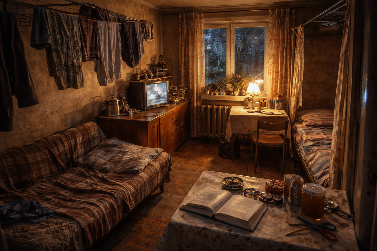 Она знала, как вечером в конце коридора пахнет картошкой с укропом, если тётя Валя получила посылку от сестры из деревни. Знала, как хлопает дверь кухни, если у бабы Шуры опять убегает молоко. Знала, как по шагам можно определить, кто идёт: папа — быстро и тяжело, будто опаздывает даже домой; мама — уставше, но ровно; бабушка — шлёпая мягкими тапками.