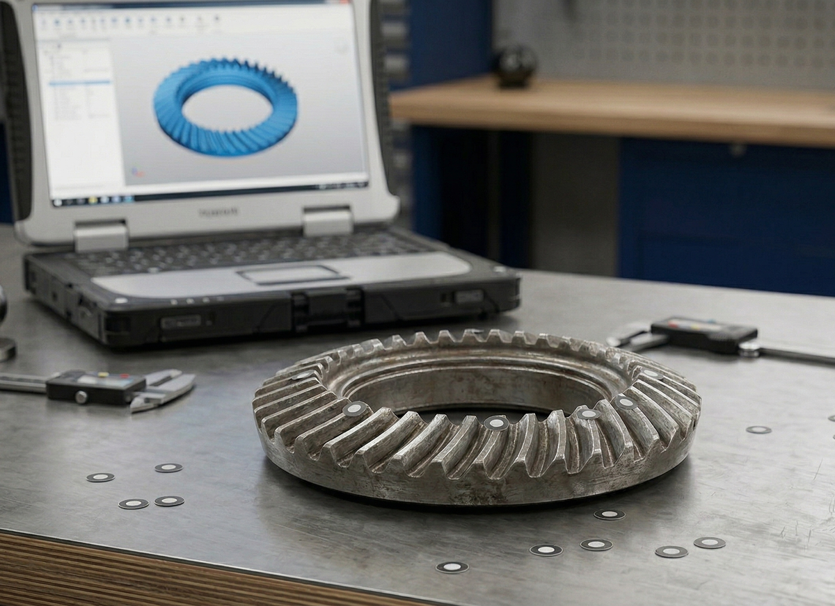 В конструкторское бюро Volkov-KB часто приносят детали, которые выглядят так, будто их жевал трансформер. Недавно к нам заглянул «привет из прошлого» — изношенная гипоидная пара. Задача стандартная: «Ребят, сделайте такую же, один в один!». Мы улыбнулись, заварили кофе и достали сканер. Но есть нюанс: если просто «отксерить» износ, получится не деталь, а дорогое высокотехнологичное ведро с болтами. Рассказываем, как мы спасали ситуацию. Первым делом мы прогнали колесо через 3D-сканер. На выходе — красивая синяя сетка (mesh). Видно всё: каждую царапину, каждый скол и ту печальную стадию жизни, когда металл решил, что с него хватит. Минутка сарказма: Некоторые «специалисты» на этом этапе заканчивают. Берут скан, суют в ЧПУ и выдают заказчику «точную копию». Если вам нужен редуктор, который воет как стая волков в полнолуние и рассыпается через сто километров — это ваш путь. Мы же предпочитаем пользоваться мозгами. Скан для нас — это не истина, а лишь «показания свидетеля», который сильно