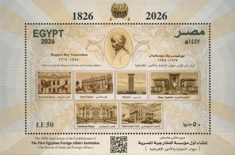 Почтовая служба Египта выпустила памятный почтовый лист, на котором размещён портрет дипломата армянского происхождения Погос-Бея Юсуфяна (1775–1844). Об этом сообщают местные СМИ. Юбилей приурочен к 200-летию создания первой структуры, занимавшейся внешними делами страны. Выпуск подготовлен в сотрудничестве с Национальным почтовым управлением в рамках Дня дипломатии, который отмечает МИД Египта. В ведомстве подчеркнули, что инициатива отражает историческую преемственность египетской дипломатии и её роль в защите национальных интересов и укреплении позиций страны на международной арене. Погос-Бей Юсуфян считается одним из основателей современной египетской дипломатии. В период правления Мухаммеда Али-паши он возглавил Диван торговли и иностранных дел, заложив институциональные основы внешнеполитического ведомства. Помимо почтового листа, к юбилею выпущена памятная открытка с изображениями исторических зданий МИД Египта в разные периоды — от дворцов Бустан и Тахрир до здания Масперо, а