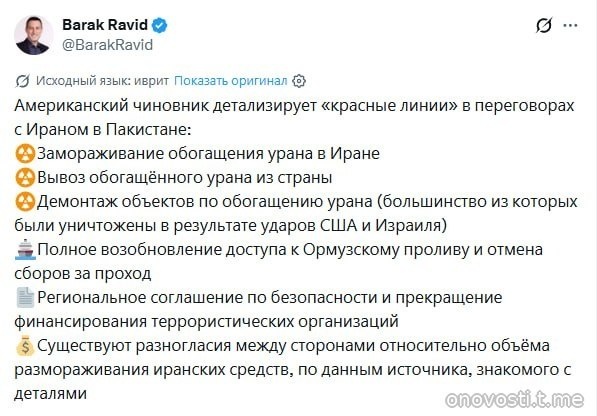 Стороны не смогли согласовать объём иранских средств для разблокировки. Вашингтон выдвинул жёсткие условия: полный отказ от обогащения урана, демонтаж ядерных объектов и прекращение финансирования ХАМАС и «Хезболлах». Об этом сообщил журналист Axios Барак Равид со ссылкой на источники. оновости.