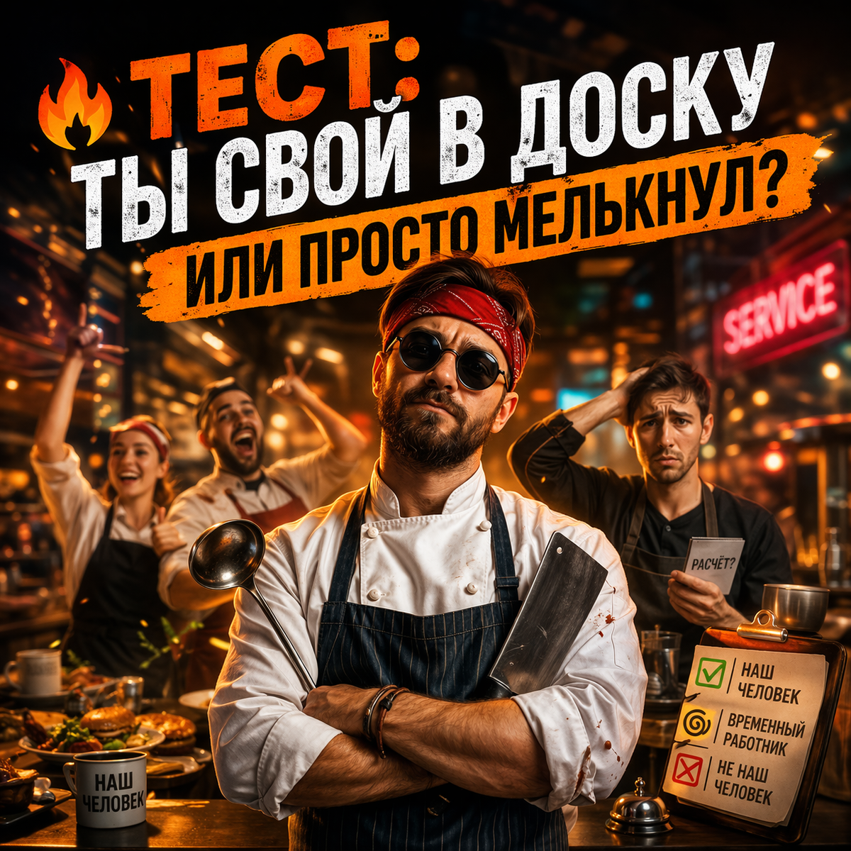 🔥 ТЕСТ: ТЫ СВОЙ В ДОСКУ ИЛИ ПРОСТО МЕЛЬКНУЛ? Для рестораторов, отельеров и всех, кто выживает в гостеприимстве Коллеги, признаемся честно: в нашем деле людей не выбирают — их выдерживают. Одни становятся легендами смены, другие — «а где мой расчёт?», а третьи... ну, они «не наши». Предлагаю пройти шуточный, но жизненный тест из 10 вопросов. Узнайте, кто вы: ✅ Наш человек — костяк, соль земли, тот, кто в огонь и в воду за стойку. 🌀 Временный работник — флажок на ветру: то есть, то нет. ❌ Не наш человек — даже чаевые не спасут карму. 👉 Правила: честно (и с улыбкой) выбирайте ответ. За каждый вариант — баллы. В конце суммируйте и читайте приговор. Вопрос 1. Гость говорит: «Суп пересолен, вы меня убили». Ваши действия? А) «Простите, сейчас поменяю и добавлю комплимент от шефа» — 3 балла Б) «Я тут не при чём, позвать управляющего?» — 2 балла В) «А вы дома соль в карман кладёте? Вкусы разные бывают» — 1 балл