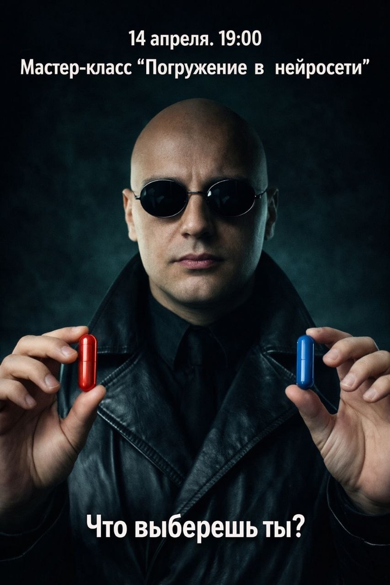 Пора выбирать 💊 Синяя таблетка: остаться в привычном мире, где на задачи уходят часы, а креатив дается с трудом. Красная таблетка: узнать правду о нейросетях и научиться использовать их силу. Если ваш выбор — красная таблетка, тогда вам к нам! 14 апреля мы проводим мастер-класс по нейросетям. За один вечер вы: 🚀 Поймете, как ИИ экономит время и ресурсы. 🚀 Научитесь генерировать тексты, видео, изображения и идеи. 🚀 Увидите, как оптимизировать рутину и автоматизировать процессы. Это не скучная лекция, а практический разбор с живыми примерами. Где и когда? 🗓 14 апреля 2026 | 🕖 19:00 🏢 Центр «Мой бизнес», Иркутск 🎟 Стоимость: 700 руб. Готовы изменить свою реальность? Жмем на кнопку «Записаться»! 👉 Записаться на мастер-класс