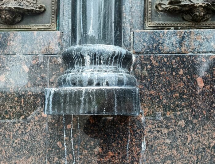 Памятник князю Владимиру и святителю Фёдору в областном центре начали спасать от разрушения в мае 2025 года. Тогда администрация города Владимира объявила тендер на проведение реставрационных работ. Торги, в результате выиграл индивидуальный предприниматель Герасимов Антон Игоревич из Ярославля. По итогам торгов стоимость контракта составила 7,59 млн. руб.В декабре 2025 года реставрацию памятника подрядчик закончил. Плиты памятника работники тщательно протёрли. Скриншот видео variant33.ru Как утверждалось, во время работ с облицовкой постамента, была выполнена установка сетки для лучшей адгезии. Способности материала прилипать к поверхности другого материала, между бетонным основанием и гранитными плитами. Что за раствор использовали реставраторы для прилипания гранитных плит – неизвестно. Но только он вытекает под воздействием дождя из межплитных щелей и образует неприятные подтёки, из-за которых памятник вблизи выглядит непрезентабельно. Подтёки на поверхности памятника. Фото читател