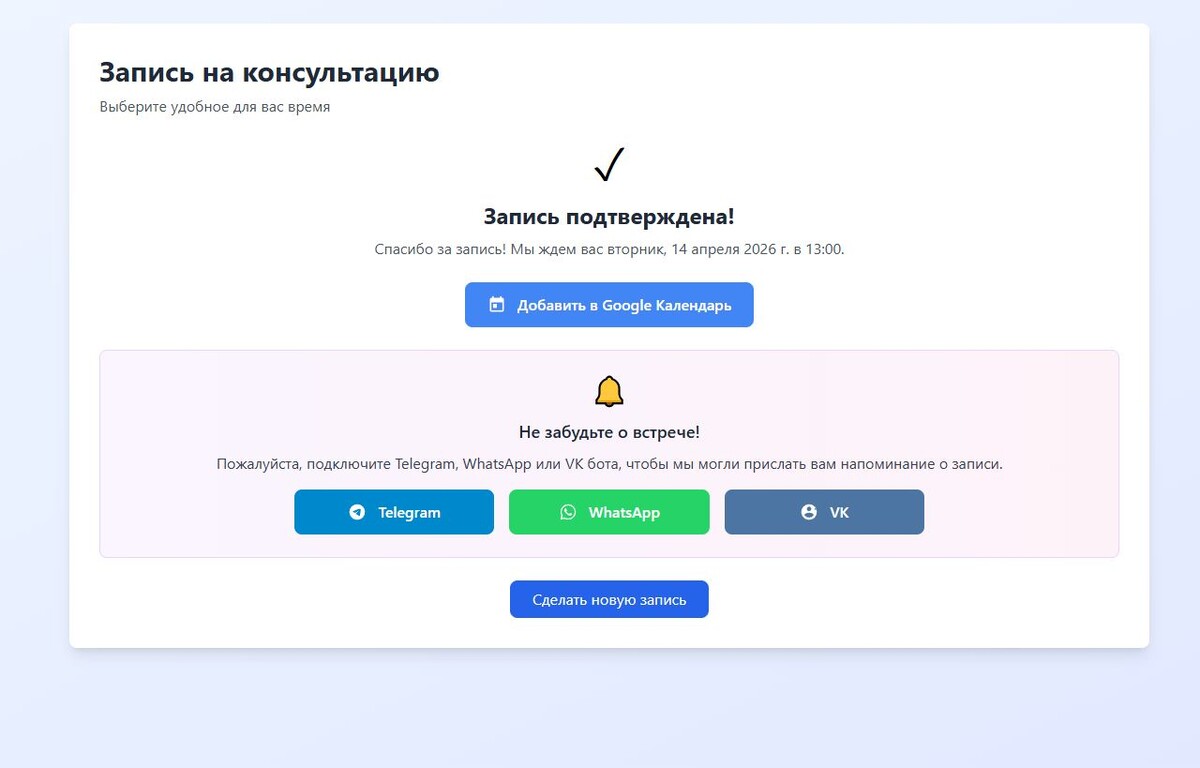 Сценарии синхронизируются с вашим реальным графиком, отображая только свободные слоты. Вы можете сами выбрать на какие даты и время будет открыта запись.