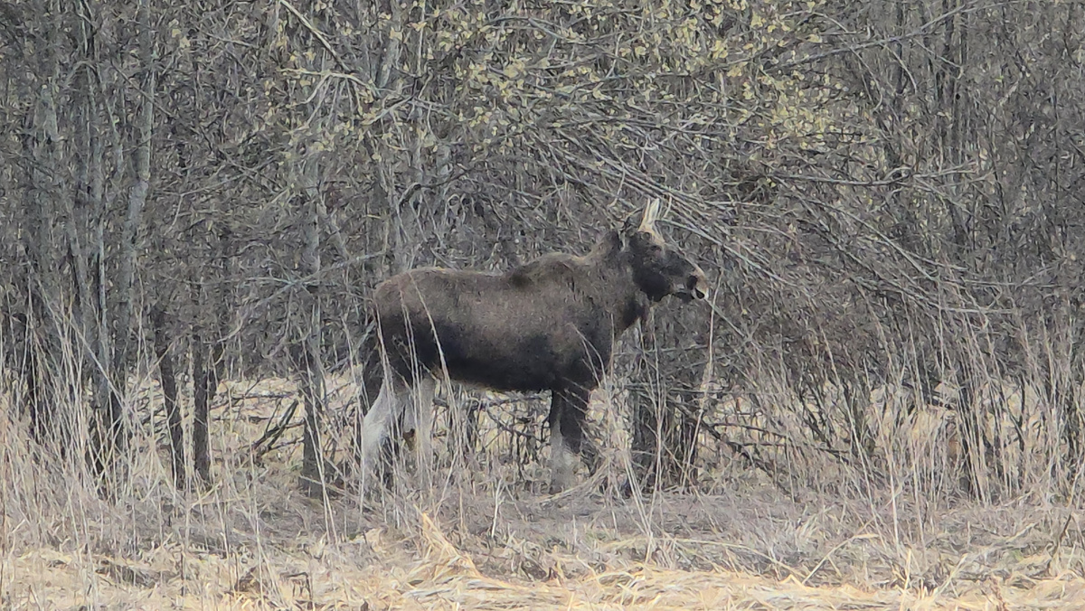 Пёс Кубик сначала побежал к лосю, потом передумал и побежал к лесу, не тревожа лося. А я шла по дороге, как шла. В самом близком месте от дороги до лося было примерно 80 метров. Это много. На телефон получалось снимать на максимальном 20икратном зуме.