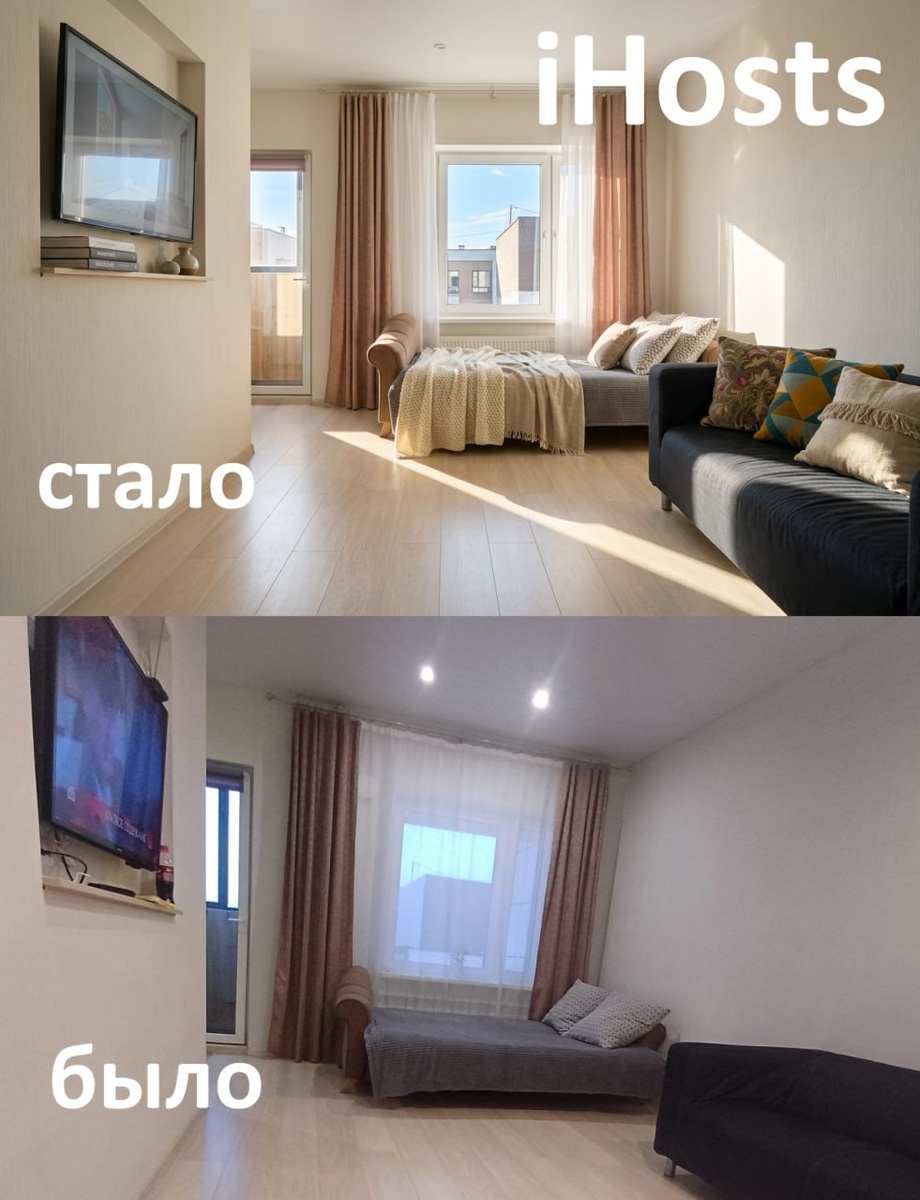 потенциальных клиентов и способствуют повышению показателя конверсии просмотры/бронирования/продажи. Влияние фотографий можете сами сравнить на примере "было-стало"... Для начала работ от Вас требуется переслать нам фотографию жилья, остальное мы сами всё сделаем 👌 Для заявок ➡️@iHosts_chat