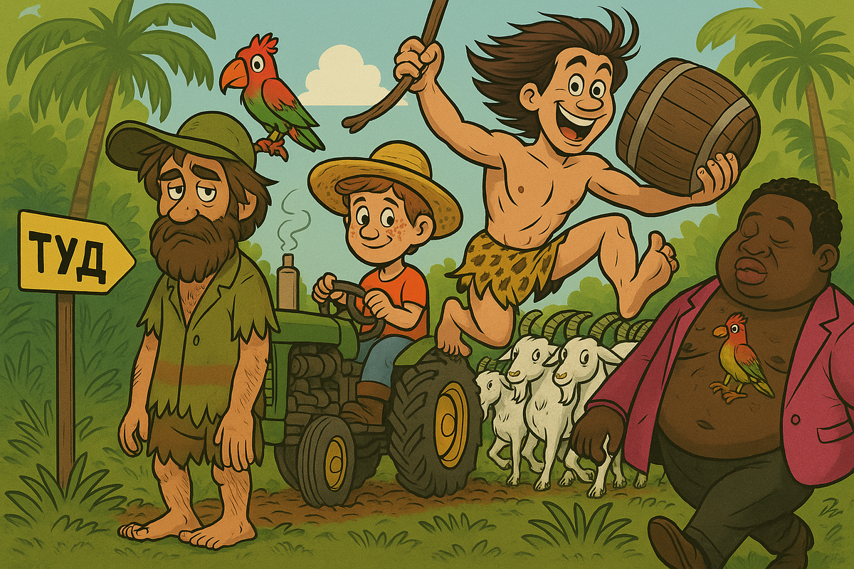 Итак, Тарзан бодро выпрыгнул из кабинета Робинзона на улицу, забыв про дверь с лестницей и попросту с криком разбив своим телом стекло окна второго этажа. Глюк, сильно набравший вес, попытался взлететь с крыши туалета казармы, но пробивший крышу этого туалета, и чудом не упавший в очко. Ну а Пятница, последнюю неделю с бочкой и последней тушей, прятавшийся на пальме от одолевавших его галлюцинаций, с пальмы аккуратно слез, и отправился в город пешком.