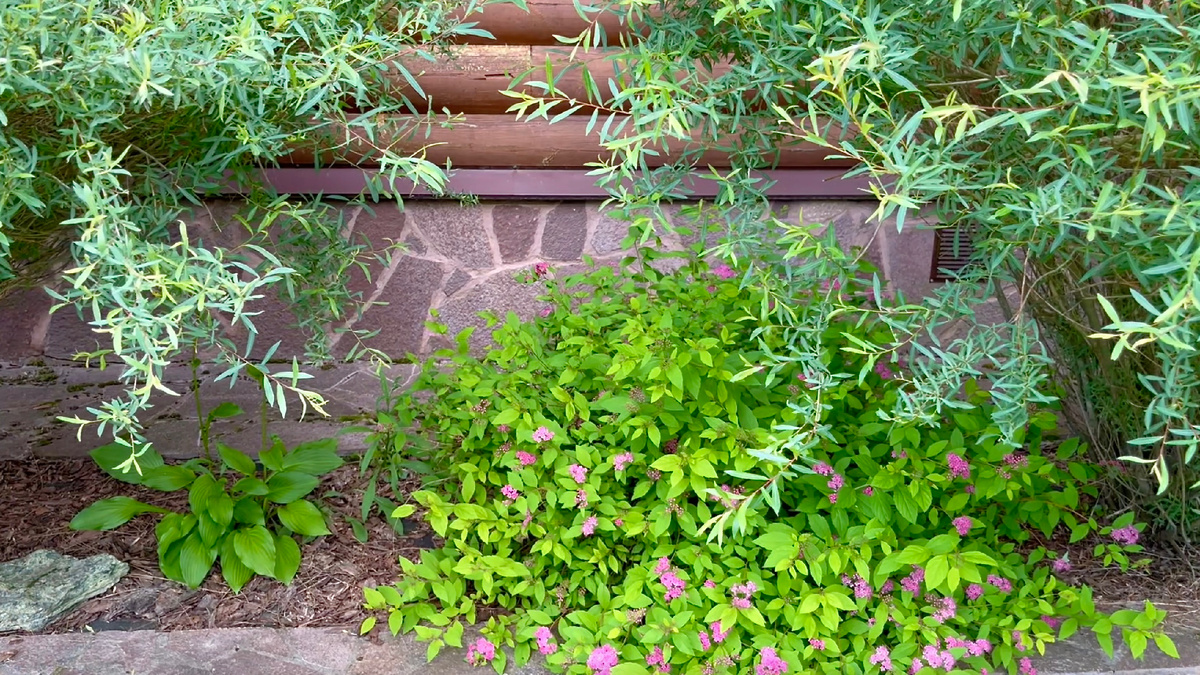 Сначала пересадили ивы, а потом решили освободить всю рабатку и уже после посадки гортензий подумать, что посадить еще. До переделки рабатка была отсыпана корой, после пересадки растений и обнововления спанбонда, решилли отсыпать щебнем, как в остальных рабатках.