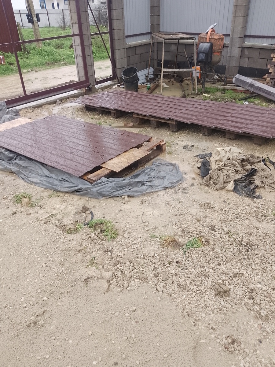 Здравствуйте наше вам. Во первым всех с праздником, с пасхой. У кого как а у меня в это воскресение сразу несколько праздников. Пасха естественно, день космонавтики, кто ж из нас в детстве не хотел стать космонавтом, наконец то весь день, с утра и до вечера солнышко, ну и еще день рождения мой. Устроили себе не большой выходной с салатиками, вином, жарким из бараньей ноги. В общем порадовались солнечному дню, крашенным яйцам и вкусному куличу. Ну а теперь собственно, что успели сделать, пока шли дожди. Дожди что то у нас разошлись, скоро будет не весна, зима, лето, а сезон дождей, сезон засухи, и сезон белых мух. Как то так. Считай всю неделю просидели дома, даже не возникло желания выходить куда то на объект и что то делать. Когда над головой постоянно висит хмурая туча, а к ногам прилипает куча промокшей глины, работать как то совсем не хочется. Но домашние дела можно в перерывах между дождями делать, чем собственно и занялся. Приехала металлочерепица на крышу навеса и пр