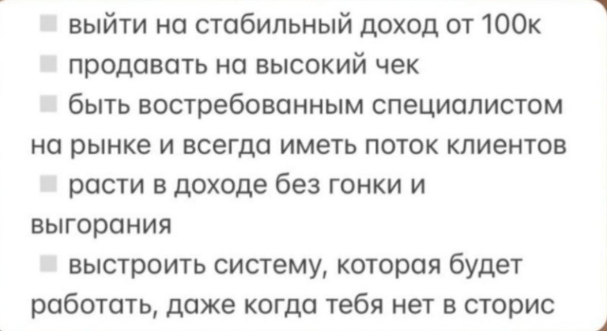Много проектов. Миллион казалось задач. Постоянно в рабочем процессе. В самом начале я даже вела 30 проектов в моменте Днём работаешь, вечером что-то доделываешь, в голове всегда список: кому ответить, что проверить, где подкрутить. И вроде мне казалось, режим многозадачности - это круто Ты востребована как специалист, сарафанка работает... Но денег больше не становилось. И вот это было самым логичным, так как мой чек был 7 тыс за проект, я боялась поднимать чек, а вдруг скажут : " Пока..." и моя самооценка упадет вниз Потому что логика же простая: делаешь больше → зарабатываешь больше А по факту - нет. Я помню момент, когда поймала себя на мысли: «я делаю очень много… но не расту» Не в ощущении, не в деньгах, никуда. Просто крутишься внутри одного уровня, стоишь на одном месте и вроде бы все понимаешь, что нужно сделать, чтобы твои услуги стоили уже не 7, а 20 и выше Но в тот момент,ты начинаешь думать, что проблема в тебе. Еще рано повышать чек, еще надо поучиться И в принципе