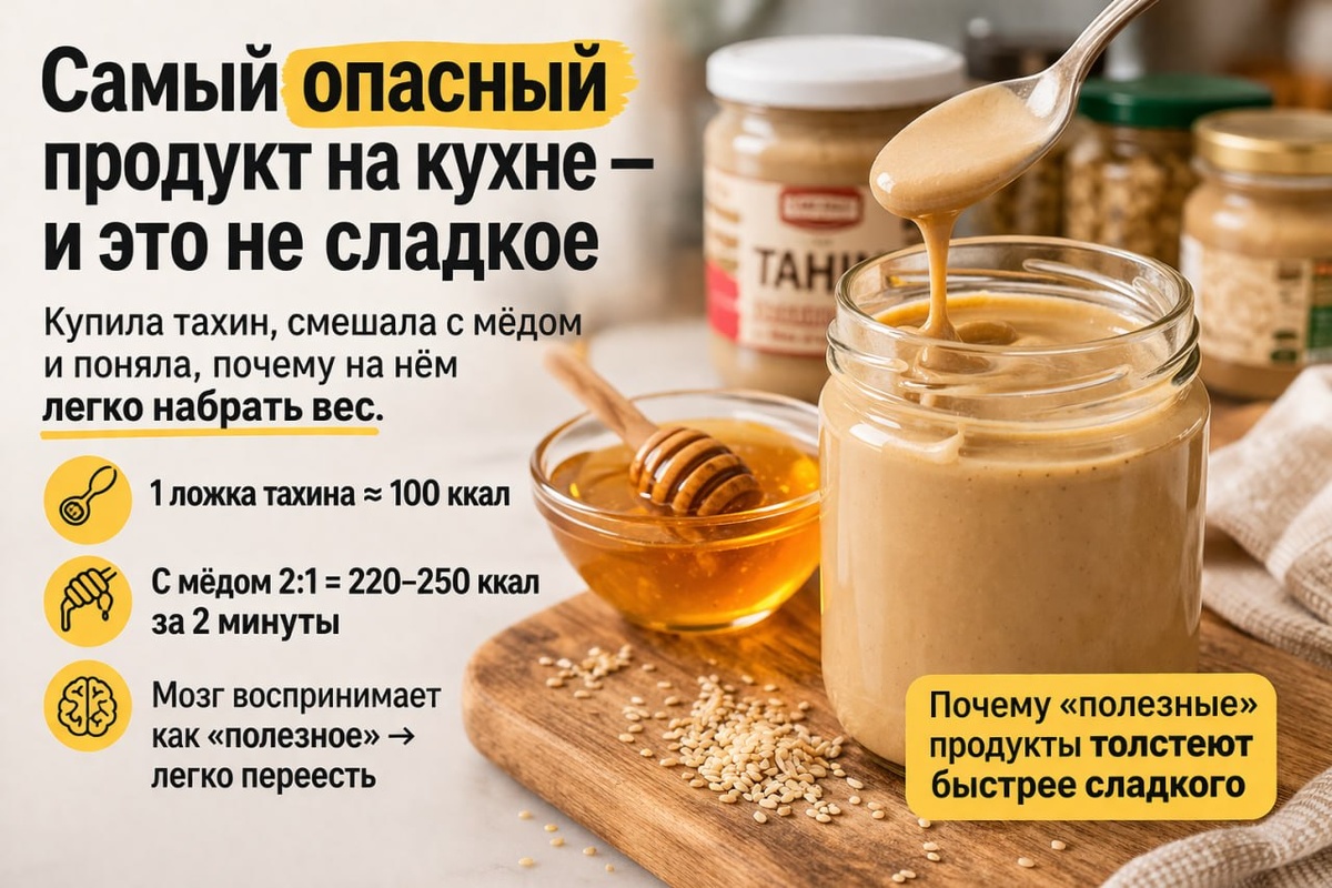 Если вы думаете, что главный враг фигуры — это конфеты, у меня для вас плохие новости. Самое коварное обычно стоит не в отделе сладостей. Оно стоит спокойно, в банке, с надписью «натурально», «полезно», «кунжут» — и выглядит максимально безобидно. Я тоже так думала. Недавно купила тахин. Классическая банка — бежевая паста, всё «правильно», всё «по ЗОЖу». В голове сразу: кальций, полезные жиры, почти медицина 😄 Открыла, смешала с мёдом (я делаю 2:1 — тахин/мёд), попробовала… и всё. Ложка, ещё одна, «ну это же не конфеты», «это вообще полезно». И в какой-то момент ловлю себя на мысли: банка уже заметно полегчала. 🛒 Полка в магазине — и главный обман Подходите к тахину — и там десятки банок: стекло, пластик, «органик», «фермерский», «двойная обжарка». Всё выглядит одинаково безопасно. Никаких тортов, никаких шоколадок, никакой «вредной еды». Просто паста. И именно поэтому тахин — один из самых недооценённых источников лишних калорий. Потому что он не вызывает тревоги. 🧠 Почему он н