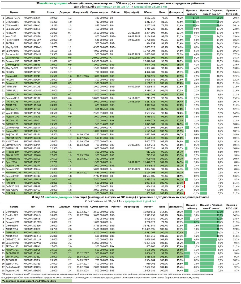 👉Чат Иволги в MAX👈 Ранжируем сравнительную привлекательность ВДО и не только ВДО по «справедливой» доходности и по доходности относительно рейтинга. В выборке наиболее ликвидные облигации с рейтингами от BB- до AA+, суммы выпусков — от 300 млн р. Тот спектр бумаг, которым, в основном Иволга и торгует. |«Справедливый» уровень доходности для каждого из кредитных рейтингов предполагает, что облигационная доходность равна доходности денежного рынка, если поправить ее на вероятность дефолта (рассчитывается на статистике дефолтов от 3 рейтинговых агентств) и возможность продать облигацию по цене 25% от номинала.| Чем больше премия доходности отдельной облигации к ее справедливому уровню, рассчитанному нами, тем выше эта облигация в 👆первой таблице. Чем, наоборот, больше дисконт – тем ниже облигация во 👇второй таблице. Зеленым выделены бумаги, входящие в публичный портфель