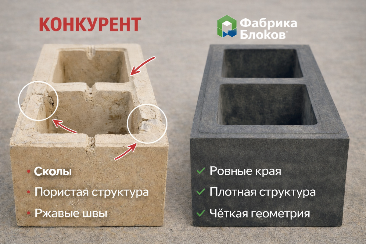 - Блок выглядит массивно. Но внутри слабая смесь. Снаружи держится, внутри крошится.