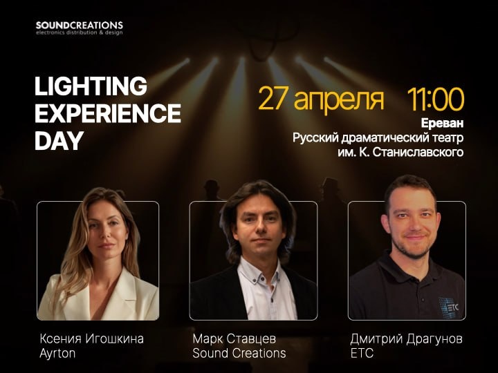 Lighting Experience Day Ayrton & ETC Приглашаем специалистов на бесплатное практическое мероприятие Lighting Experience Day, посвящённое современным световым технологиям Ayrton и ETC. Марк Ставцев (Sound Creations), практикующий художник по свету совместно с приглашенными экспертами - Ксенией Игошкиной (Ayrton) и Дмитрием Драгуновым (ETC) - подготовили насыщенную программу погружения в современные сценические световые технологии: Демонстрации возможностей 🟡новинки Ayrton Stradale Profile, MagicDot Neo и Nando 502 Wash 🟡прожектор ETC Lustr 3 🟡консоль ETC Eos Практика для всех участников 🟡работа с эффектами gobo, prism, animation wheel 🟡работа с Fixture Manager 🟡программное управление с Ayrton App 🟡сценарии управления светом Ценные призы за участие в дискуссиях, внимательность и профессиональную вовлечённость в процесс. Регистрируйтесь, чтобы получить QR-код для бесплатного участия! Количество мест ограничено. 27 апреля 2026 11:00–16:00 Ереван, малая сцена Русского драмат