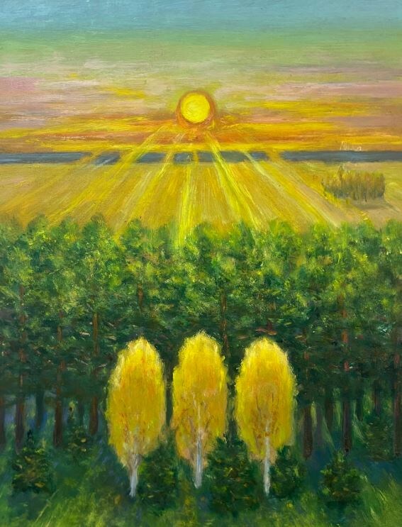 Оргалит, масло, 49 × 38 см. Есть картины, которые не столько рассказывают сюжет, сколько сразу задают настроение. Здесь все построено на ощущении света: солнце не просто поднимается над горизонтом, а словно заполняет собой пространство, проходит лучами через небо и ложится на лес внизу. Благодаря этому картина воспринимается очень открыто, тепло и по-хорошему искренне. По характеру это лирический, декоративно-образный пейзаж. Художник не стремится к фотографической точности: деревья, небо, линия горизонта и само солнце работают здесь прежде всего как эмоциональный образ. Особенно выразительно смотрятся три золотистых дерева на переднем плане — они будто откликаются на солнечный свет и делают всю композицию еще более цельной. Мне нравится, что в этой работе нет тяжести и сложной драматургии. Она говорит о простом, но очень важном: о свете, начале дня, внутреннем отклике на мир. Это живопись, которая действует не через детали, а через чистое