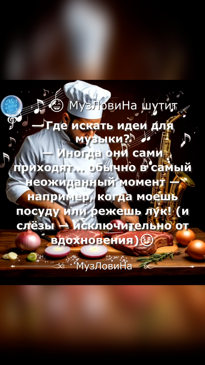 МузЛовиНа шутит — Где искать идеи для музыки? — Иногда они сами приходят... обычно в самый неожиданный момент — например, когда моешь посуду или режешь лук! (и слёзы — исключительно от вдохновения) Музыка от души — в ваши сердца! 🎶 Ваш Канал @muzlovina (МузЛовиНа) ! В клипе звучит музыка из песни "Игры в Мафию" (Anna_angel_ina) #шутка #магия #человек #звук #сердце #работа #хук #шефповар #игрывмафию #муза #музыка #вдохновение Видео: https://vk.ru/video-234057279_456239141