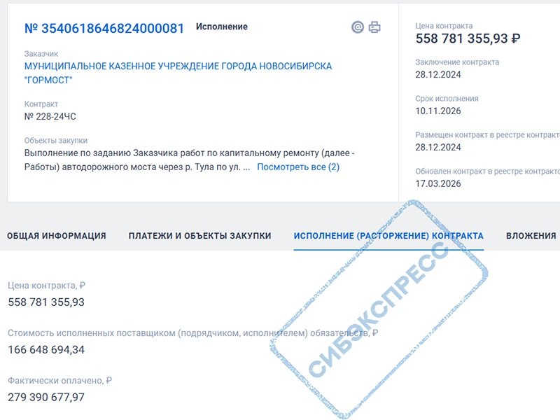 Мост через реку Тула в Кировском районе Новосибирске не удаётся отремонтировать в срок, заявили в прокуратуре. Работы идут по нацпроекту «Инфраструктура для жизни». «Контракт на выполнение работ был заключен в декабре 2024 года, срок его исполнения истекает в ноябре 2026 года. Однако до настоящего времени строительная готовность объекта достигла лишь 43%, что создаёт предпосылки к срыву реализации национального проекта», — констатировали в прокуратуре. Муниципальное учреждение «Гормост» подписало договор на ремонт моста с ООО «ПК Моствекторгрупп» за 558,7 млн рублей. В карточке контракта на сайте госзакупок указано, что фирма уже получила почти 280 млн, а работы были приняты только на 166,6 млн. Компания, по данным сервиса «Контур. Фокус», принадлежит Антону Дворяжкину. Она зарегистрирована в 2021 году и уже успела получить муниципальные и государственные контракты на сумму свыше 800 млн рублей. 📌 На время ремонта поста через Тулу власти организовали временный мост, но и он, по сл