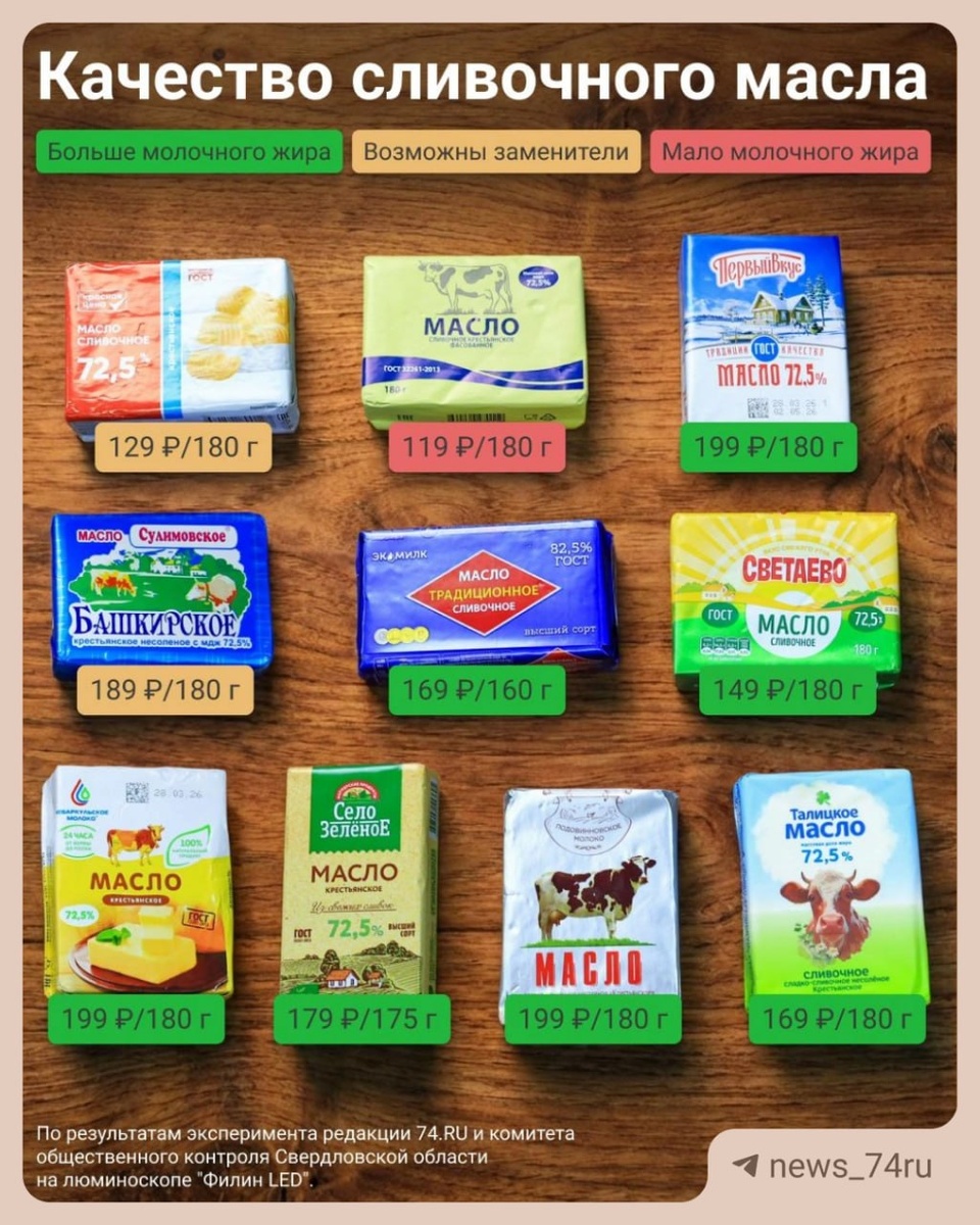 В последние годы масло сильно дорожает, и за эти деньги хочется купить качественный продукт без заменителей молочного жира. Разбираемся, можно ли проверить «молочность» продукта. Редакция @74.ru проверила 10 пачек сливочного масла, которое было куплено в разных сетевых магазинах. 🟥 Как проверяли. С экспериментом помог «Комитет общественного контроля Свердловской области», эта организация сотрудничает с Уральским межрегиональным управлением Россельхознадзора и проводит собственные проверки качества разных потребительских товаров. Масло проверяли с помощью люминоскопа — это бокс, внутри находится ультрафиолетовая лампа. Она поможет узнать, как много в масле молочных жиров. Из каждой пачки брался кусочек и сравнивался с «эталоном» — маслом с самым высоким содержанием молочных жиров. Что проверяли. ▪️ «Первый вкус» — 199 рублей за 180 граммов, АО «Росмол», заводы холдинга есть в разных городах, проверенный образец сделан в Челябинске; ▪️ «Чебаркульское» — 199 рублей за 180 граммов, ОАО