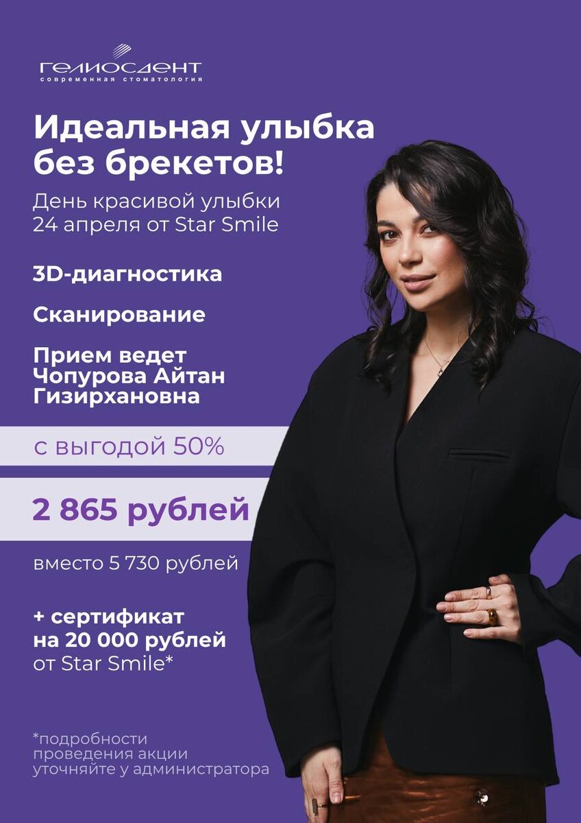 ». Участие — по предварительной записи. ⭐ Консультация Чопуровой Айтан Гизирхановны + комплексное ортодонтическое обследование — 2865 ₽ вместо 5730 ₽ В стоимость входит: • 3D сканирование на iTero; • визуализация будущей улыбки; • анализ 3D томографии; • предварительный план лечения на элайнерах Star Smile. 🎁 Подарок каждому участнику: Сертификат 20 000 ₽ при принятии решения о лечении. 📞 Предварительная запись обязательна: +7 (343) 317-33-32