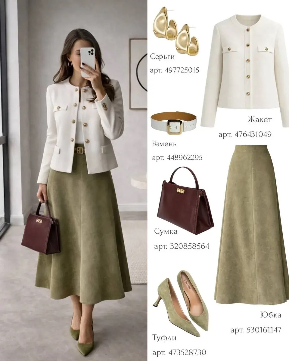 Первый образ — пример мягкой и очень благородной классики. Оливковая юбка миди выглядит дорого и сдержанно, а белый жакет с декоративными пуговицами делает комплект более собранным и утонченным. Ремень подчеркивает талию и аккуратно завершает силуэт, а сумка в глубоком коричневом оттенке добавляет теплоты.