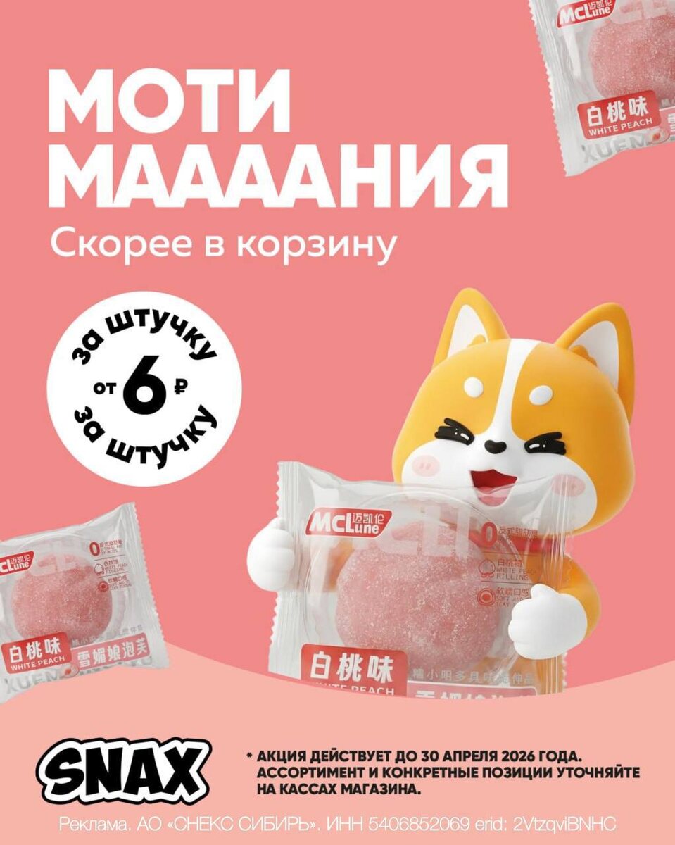 😱 Сегодня МЕСЯЦ, как официально мы открыли первый магазин сладостей и снеков со всего мира в Сибири! За этот месяц нас появились первые постоянные клиенты, новые партнёры, стабильно вирусящиеся ролики, а мы запустили щедрейшую акцию на моти. В то время как всё и везде дорожает, в SNAX — настоящая сладкая революция — МОТИМАНИЯ 😍 Персик, манго, шоколад, экзотический дуриан и куча других вкусов. ⏰ Акция действует до 30 апреля — успей, пока самые популярные вкусы не разобрали И подписывайся на SNAX.Сибирь — там ещё больше анонсов скидок, розыгрышей подарков и новинок со всего мира 💛 Магазины есть и на левом, и на правом берегу — сохраняй адреса: 📍 ТЦ Континент, ГБШ 20 📍 ТК РЕКА, ул. Большевистская 45/1 📍 ТРЦ Континент, ул. Троллейная 130а