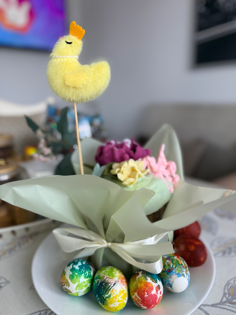 Потом был завтрак. Куличи, яйца, творожная пасха. За столом каждый выбирал свой любимый кусочек. Кому-то — верхушку со сладкой белой помадкой, а кому-то — всё остальное 😀. И это тоже наша маленькая традиция.