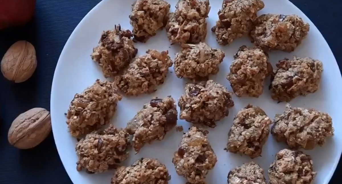 Это печенье без муки, масла и сахара — только натуральные продукты. Финики и яблоко дают природную сладость, а овсяные хлопья делают его сытным. Готовится проще простого.