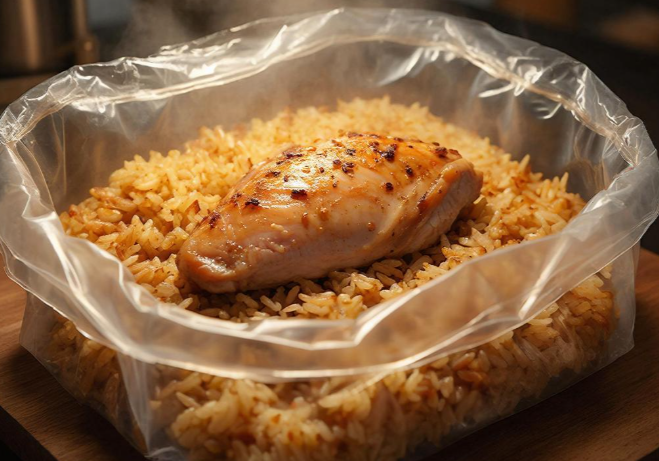 Так лень готовить, ну просто сил нет, а покушать вкусно хочется всегда. Тогда этот рецепт для вас - ничего сложного делать не нужно, все составляющие есть дома. Целая курица в пакете для запекания станет отличным, сытным вариантом ужина для ленивы и тех, кто постоянно ничего не успевает, а ещё бюджетным и хватает на долгое время. Час и готовое блюдо с гарниром на столе. 1. Начнём с простого, но важного шага: курицу тщательно промываем, обсушиваем бумажным полотенцем и натираем смесью приправ — 2 чайные ложки специй ( куркума, карри, сушеный чеснок, паприка - что вам больше нравится ), соль по вкусу. Затем добавляют 2 столовые ложки растительного масла, аккуратно втирая его в курицу. 2. Второй этап подготовка гарнира к курице. Морковь и лук чистим, морковь нарезаем. Лук используют целый, некоторые вставляют в лук несколько гвоздик для вкуса и аромата. 3. В это время возьмите пакет для запекания, завяжите с одной стороны. В пакет выкладываем промытый стакан риса, сверху заливаем 2 стака