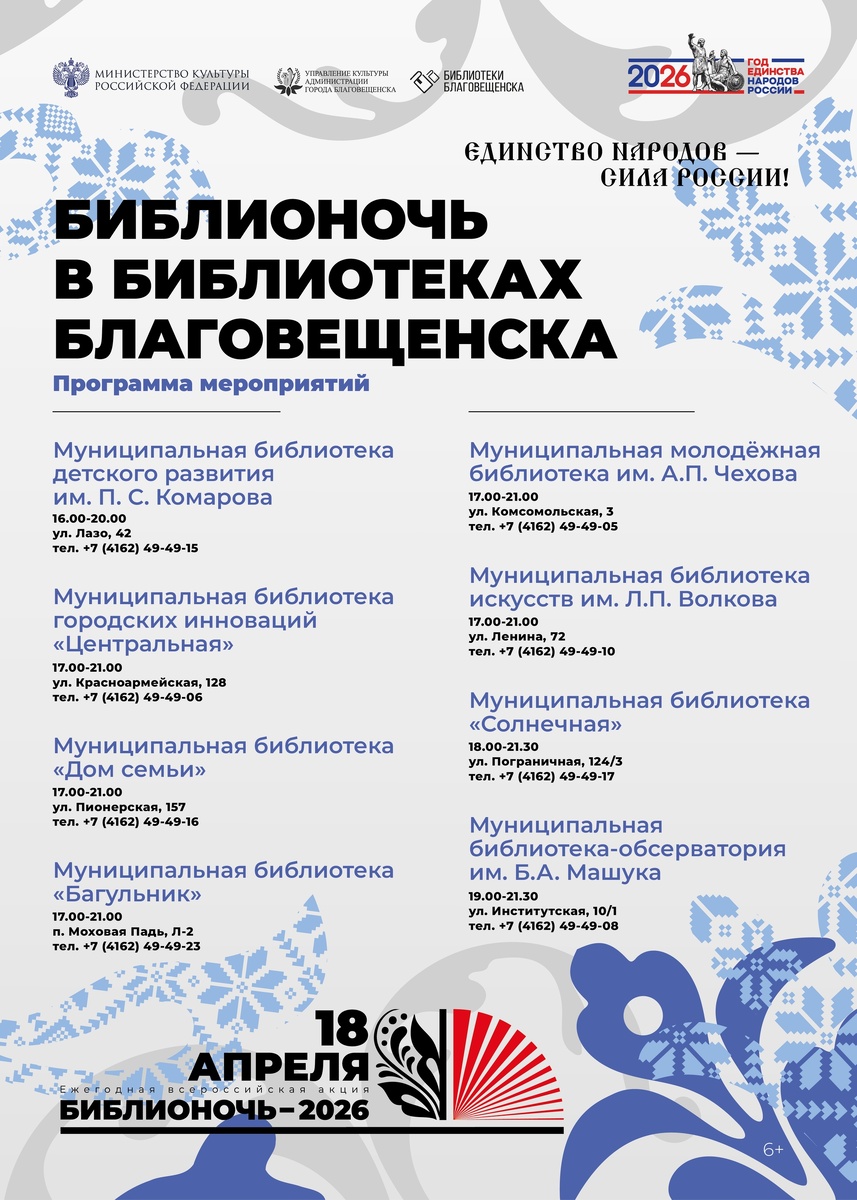 В Библиотеках Благовещенска 18 апреля состоится главное библиотечное событие апреля – Библионочь! Девиз Библионочи этого года - «Единство народов – сила России». На сегодняшний день в Благовещенске 8 модельных библиотек (осенью этого года откроется ещё одна, 9-ая по счёту) , поэтому культурных событий в эту Библионочь не счесть.