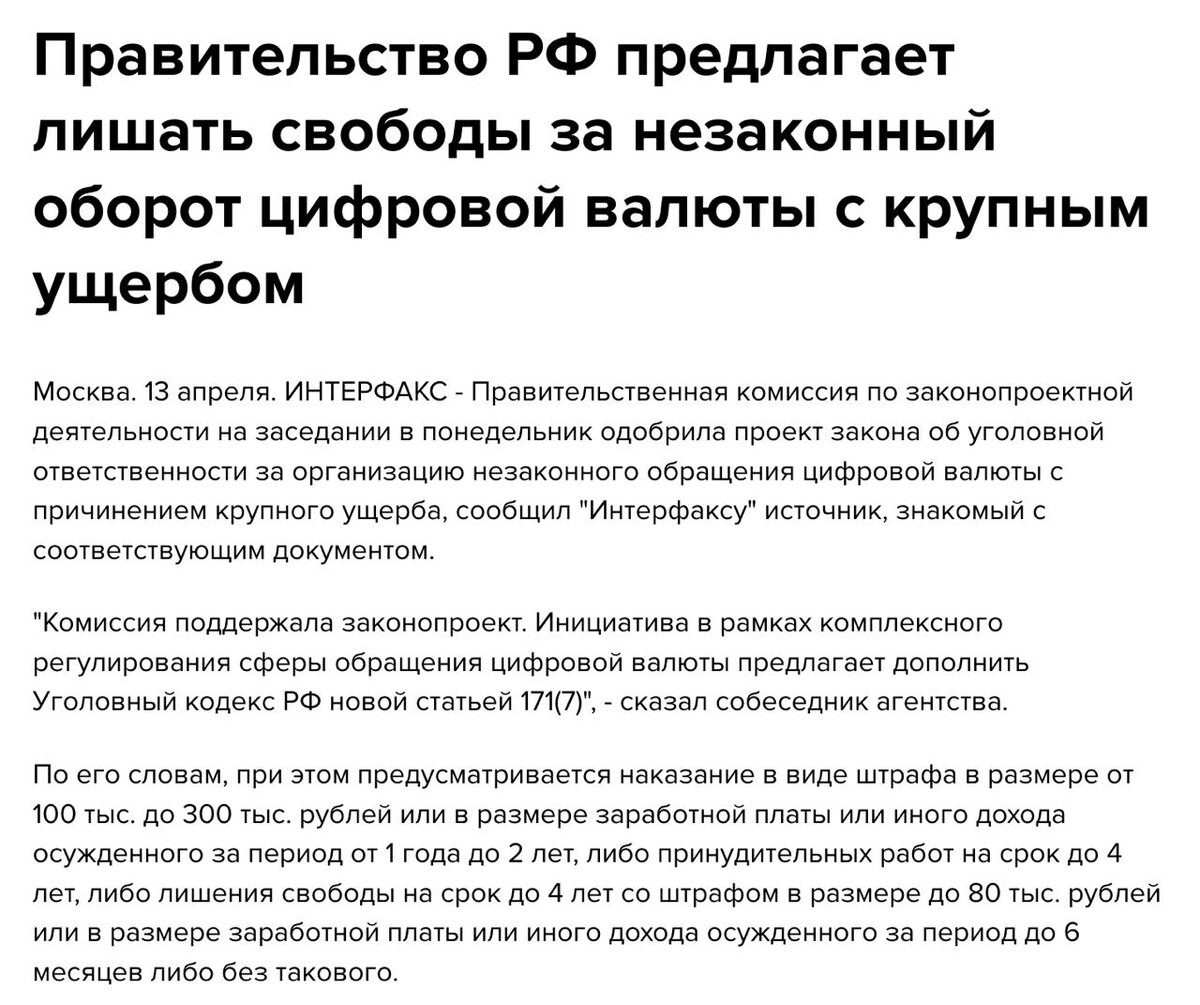 Правительство РФ одобрило законопроект об уголовной ответственности за незаконный оборот цифровой валюты с причинением крупного ущерба. Если коротко: ➠ В УК появится новая статья – 171.7. ➠ За «серые» схемы с криптовалютой могут дать до 4 лет лишения свободы. ➠ Альтернатива: штраф 100–300 тыс. руб. или принудительные работы. ➠ Для организованных групп или при особо крупном доходе – до 7 лет тюрьмы. Штрафы – до 1 млн. руб. Порог: ➠ Крупный ущерб – от 3,5 млн руб. ➠ Особо крупный – от 13,5 млн руб. Crypto Headlines